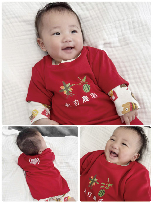 以前にウエアを制作させていただいた米吉農園様は、お孫さんが誕生されたとのことで、ベビーサイズのTシャツ作成依頼をいただきました!とっても可愛い着用写真も送っていただきました〜🥰!よく似合っていますね😆